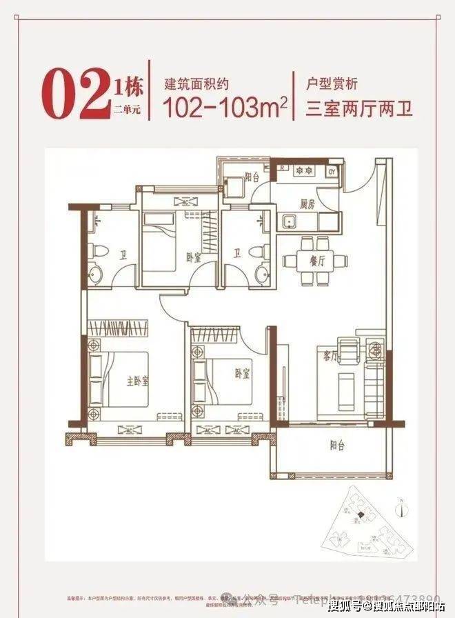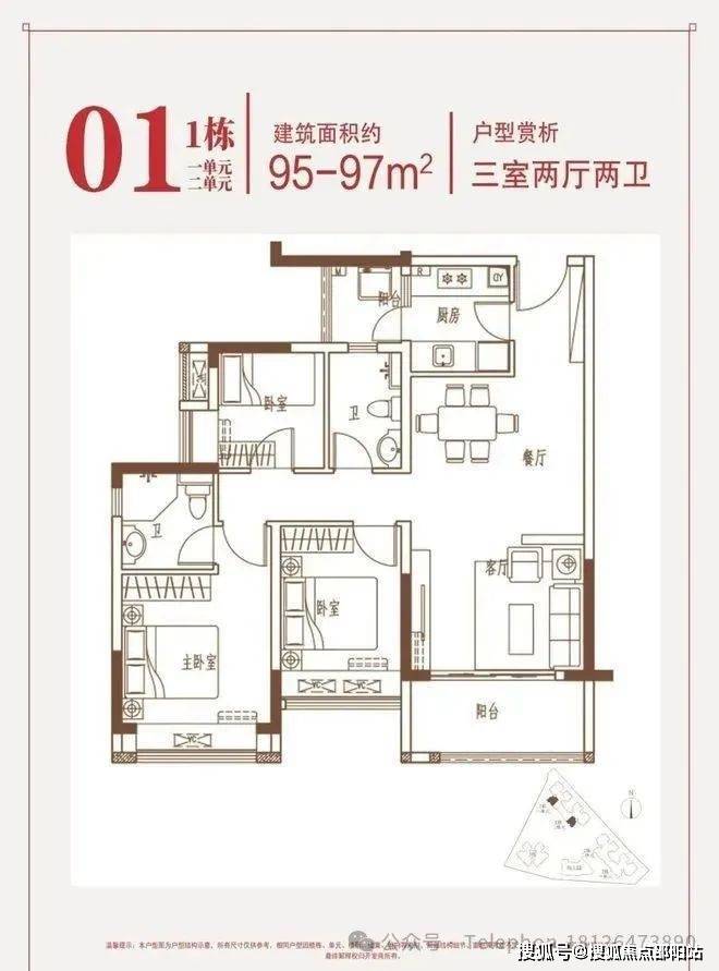 约95-97㎡三房:南向端头位,三面采光,花园瞰景。