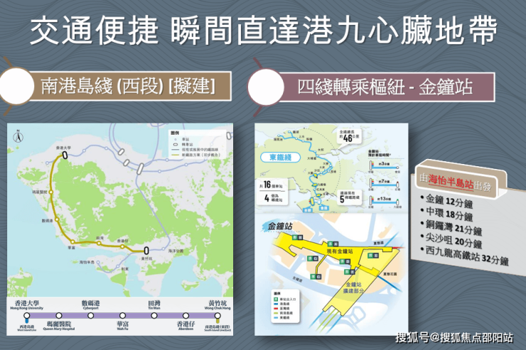 生活圈层:一线无遮挡海景,临海而建,背山望海,享有开扬广阔海景和翠绿山景,项目附近的利南道沿线有巴士路线来往鸭脷洲利南道工业区、石排湾、香港仔市中心、海怡半岛、黄竹坑、铜锣湾、北角及九龙钻石山站等多个地方。