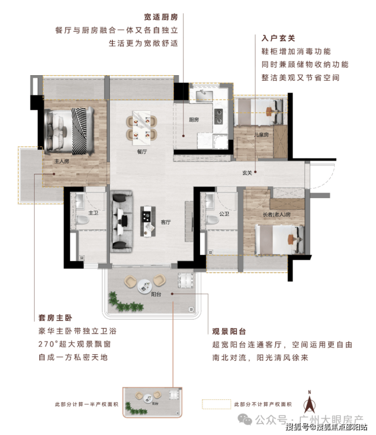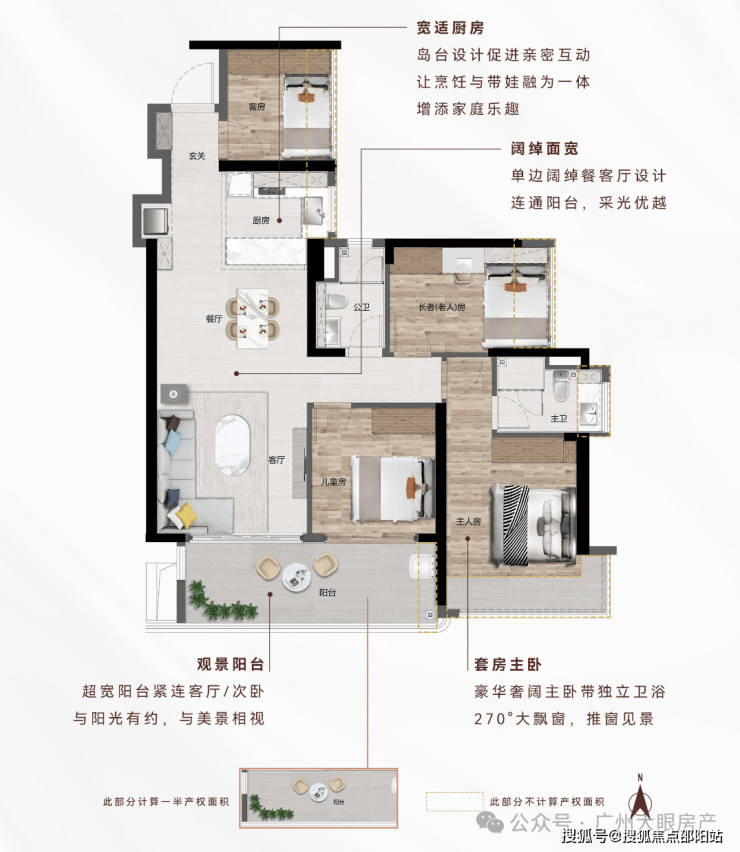南北通透|主卧 270°飘窗+双飘窗|U 型厨房|南向观江景阳台