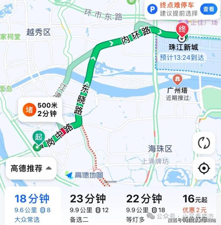 自驾去珠城:走昌岗中路转到东晓路,再转内环路至黄埔大道西,全程9.6公里,耗时18分钟左右。