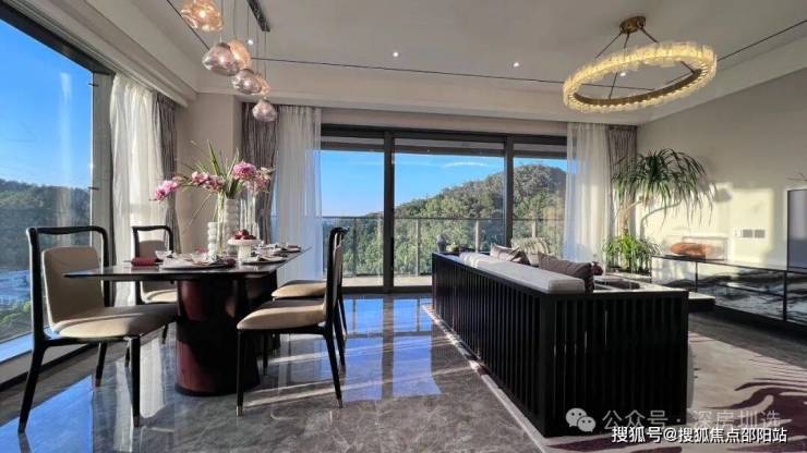 通过四栋高低错落的建筑天际线与高低起伏的梧桐山脊相呼应,让空间与山景结合,自然入室;青山远黛园景,窗窗见景。