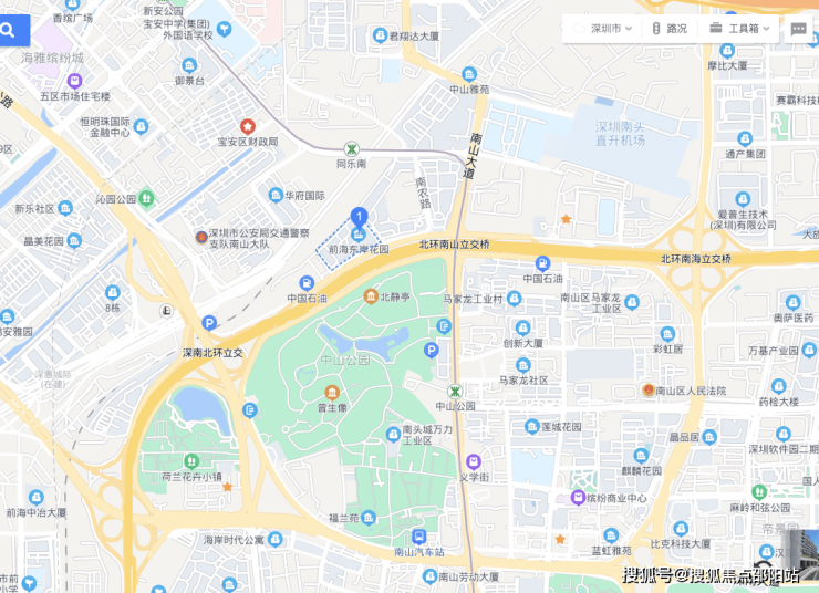 项目南侧是南山区中山公园与项目相隔北环大道,通过人行天桥连接。中山公园是深圳最大、历史最悠久的城市公园。占地面积达49万平方米(相当于4个豪方天际和4个前海东岸占地大小),定位为城市形象名片,里面有儿童娱乐场所等休闲设施,是周末、空闲时、晚饭后散步游玩的好去处。