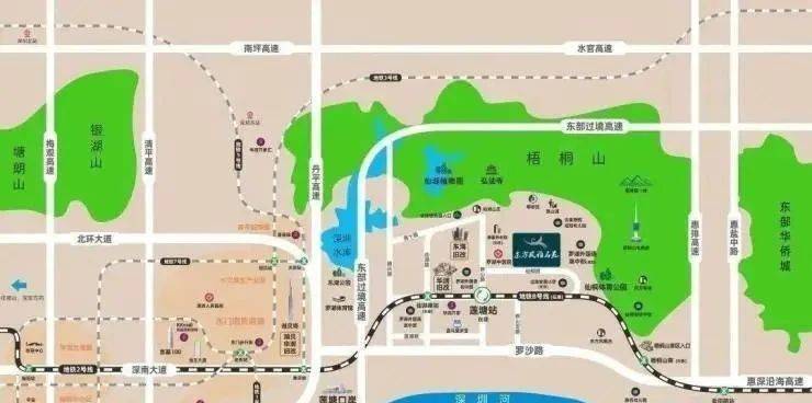 景观项目周边有“一水七公园”环绕,分别是深圳水库、围岭公园、布吉公园、求水山公园、洪湖公园、银湖山郊野公园、东湖公园、仙湖植物园。