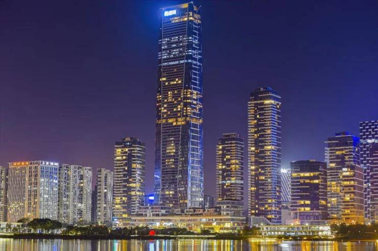 深圳湾一号外立面材料采用2.4米宽幅、全景、无梁幕墙。整体晶莹剔透,凹凸有致,具有现代化的抽象美和立体感,在夜晚灯光打开时,显得更加璀璨。