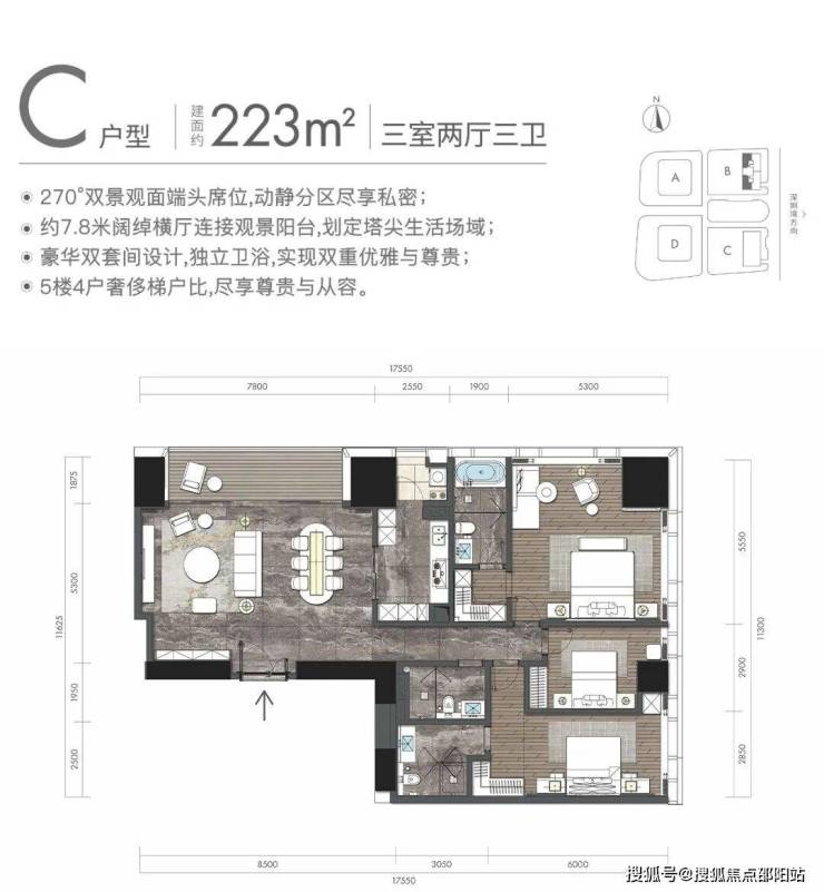 160㎡2房售罄,223㎡3房,343㎡4+1房,580㎡5房6卫