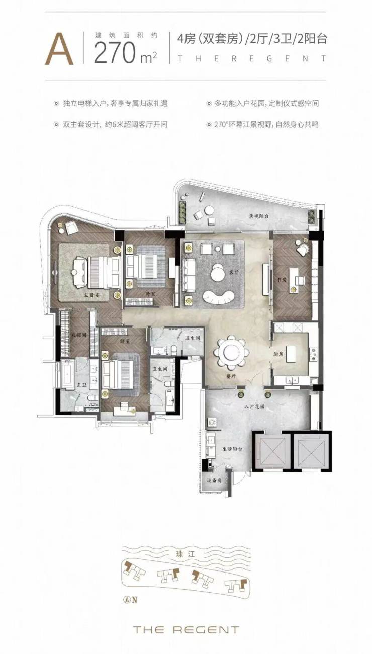 190㎡户型南北对流双阳台,南看2万方花园绿洲,北望珠江新城CBD,这就是触手可及的豪宅“天花板”该户型设有入户玄关和储物间,通过将客厅、餐厅、厨房和阳台一体化设计,LDKG布局创造了一个开放、共享的生活空间,使家庭成员可以更容易地聚集在一起,享受家庭时光。