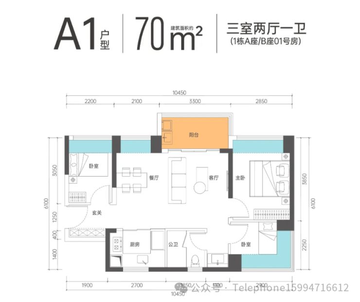 A1户型-70㎡的2房1卫,设计的竖厅格局,客厅3.3米开间,U型阳光厨房,有西南及东南朝向。