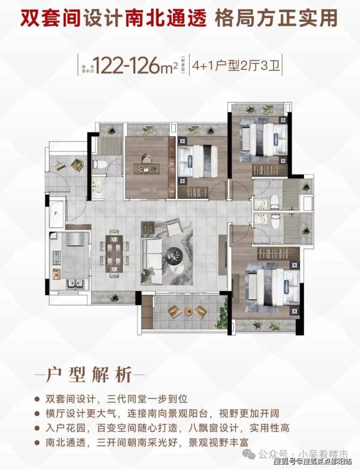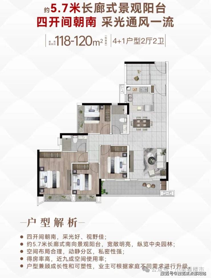 建面120平4+1房,入户处多了一个灵动空间,可改成5房,四开间朝南,全屋大飘窗设计,5.7米观景大阳台,U型厨房。