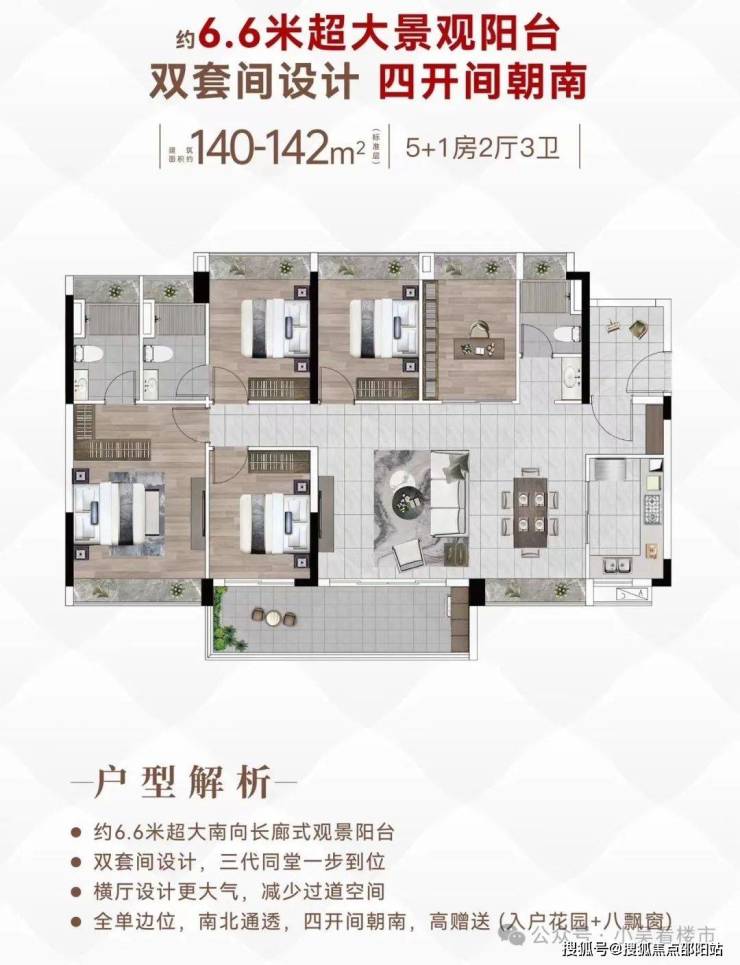 建面140平五房,此户型在126平的基础上放大空间,并将双开间阳台升级到6.6米,全单边位+五开间朝南+全屋南北对流。