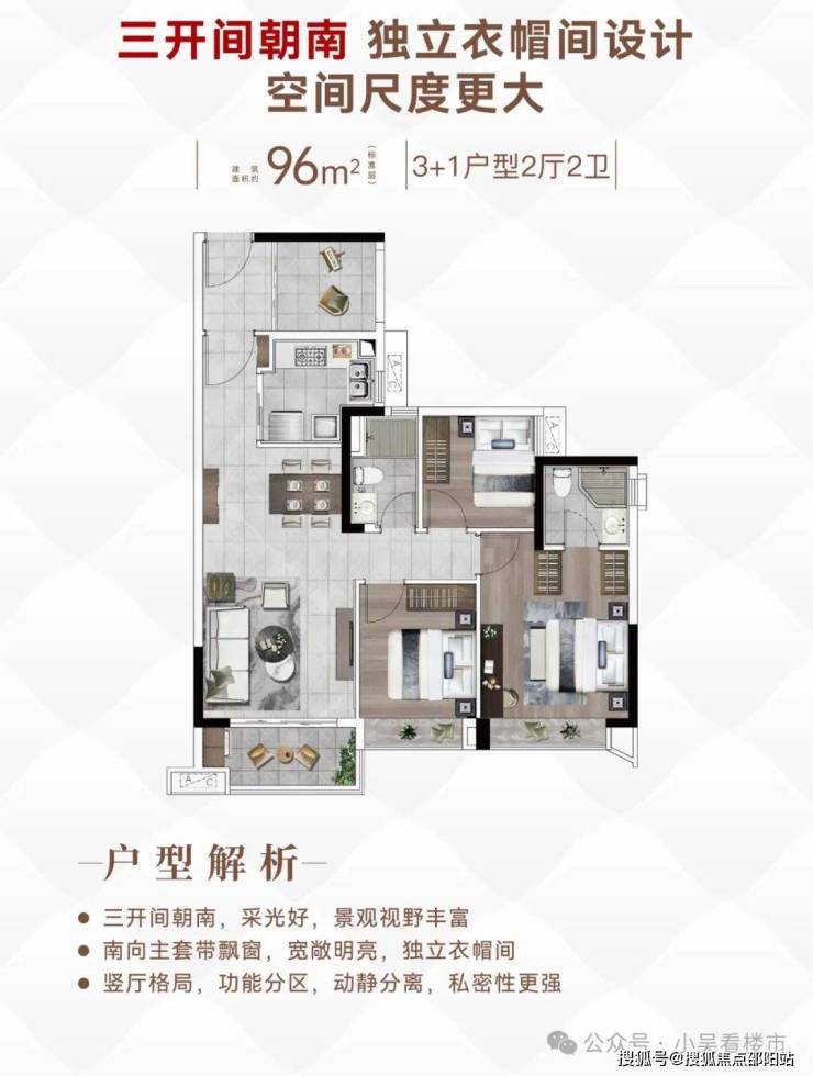 建面96平3+1房,户型动静分离,格局方正,三开间正南向,多一房可用于茶室、娱乐室、书房多功能使用。