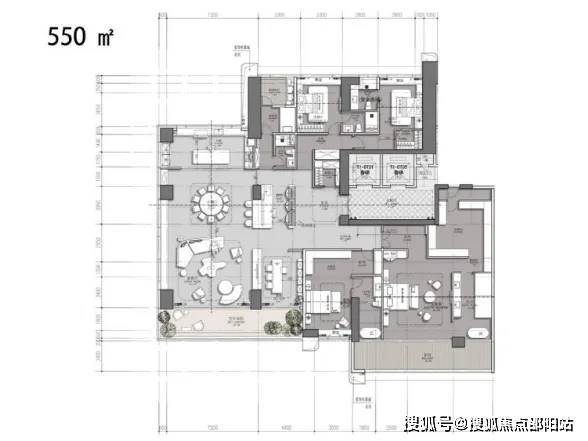 面积约550㎡四房,1号楼高区四房户型,独梯入户对景玄关,超展开主卧,功能齐全;公私区双阳台,270°无敌视野;沉浸式展廊,彰显主人风采,还配有酒吧、茶吧以及超尺度方厅最大化满足社交需求,可以说是平层“豪宅”。