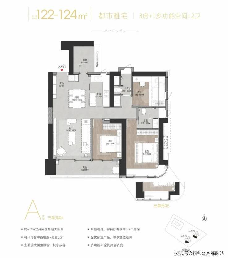 04/05 A户型——建面约122-124㎡3+1多功能空间:竖厅户型,双阳台设计,西南朝向。