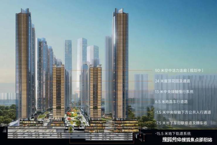 创新打造地上地下七重结构立体化交通系统,不同交通系统分层互联,人行系统、城市公共道路系统、地下轨交系统快速接驳,最大程度实现人车分流,科学化疏解交通压力。