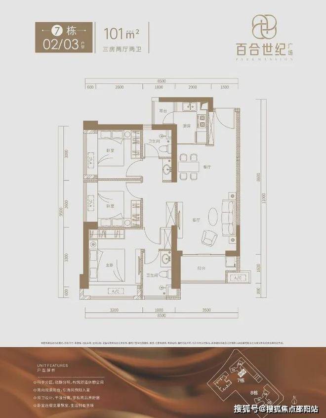 7栋101㎡的3房2厅2卫,设计的是竖厅格局,餐客厅一体化,客厅3.5米开间,3个卧室宽度分别为3.2/3/2.6米,阳台1.6米进深,L型厨房,有带1个小生活阳台,都是东南朝向。