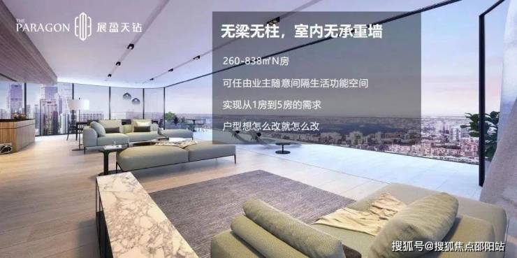 室内无梁无柱、无承重墙的宴会厅式室内设计,让260至838平方米的平层空间可任由业主发挥创意,随意间隔生活功能空间。此外,单位标准层高达3.7米(部分顶层单位的楼高甚至达到6.9米),造就中山难得一见的超级大平层。