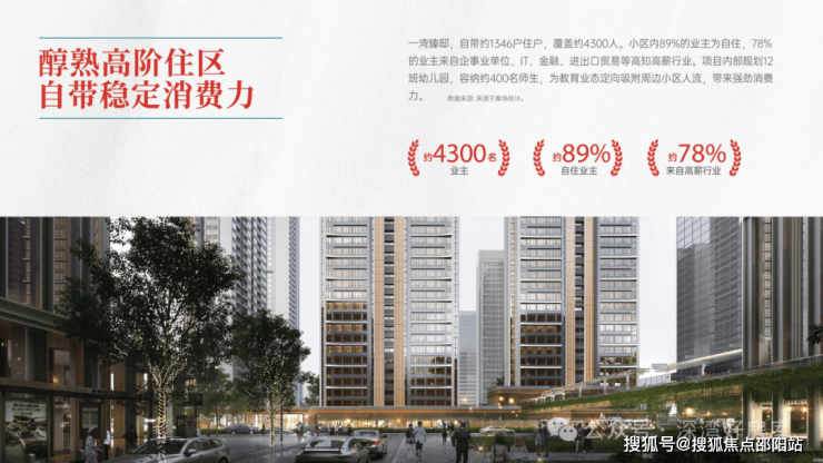 7、稳客源:项目自带约4300名住户,78%来自高知高薪行业。自带12班制幼儿园,项目附近规划两所九年至一贯学校,定向吸附约1万+师生人群