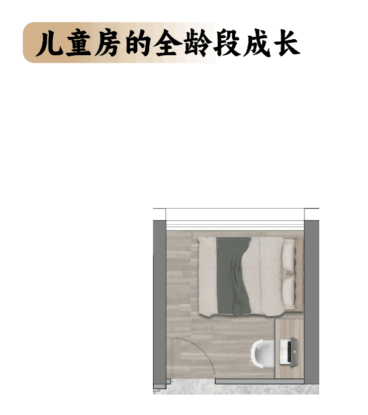 儿童房采用更适合儿童的短面宽、长进深设计,摆放单人床、衣柜后,仍能放得下1.2米学习桌,足以陪伴孩子从小学到高中。