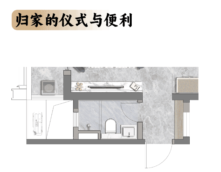 先是入户转折玄关,巧妙地区分了内外空间,旁边的客卫让家人或客人进门即可完成身份切换,洗去疲惫,同时也有效保障了主人空间的私密。