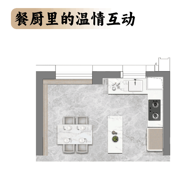 厨房采用回形洄游动线,高效串联“取、洗、切、炒、盛”流程,2.5米开间的双人厨房,彻底告别“一个人的厨房”的家庭困境。