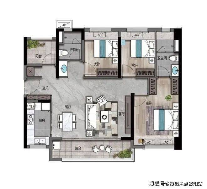 101㎡四房:约11米的南向“全面宽屏”采光面设计,空间没有丝毫浪费,让生活的舒适感无限叠加。一体化餐客厅设计与约5.8米的景观大阳台相互连通,舒适感与尊贵感随风而来。