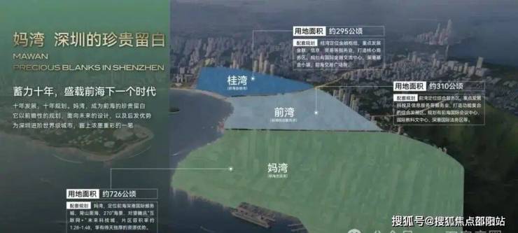 根据规划,妈湾有2.9平方公里的土地由招商局集团和前海管理局合资成立的公司统一开发运营,最新定位是前海深港国际服务城,与桂湾深港国际金融城共同组成了前海双核,是前海扩区后的首要、重点推进项目。