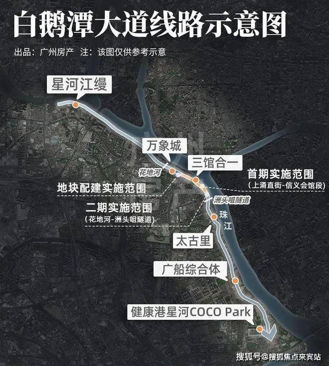 目前,白鹅潭大道星河江缦段已建成通车,花地河-洲头咀隧道段、上涌直街-信义会馆段均已经动工。
