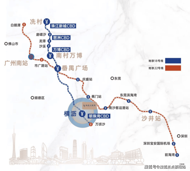 18号线串联珠江新城、琶洲新区、番禺万博、国际金融岛四大城市CBD,南延线通达中山、珠海。1站可换乘22号线,可通达东莞、深圳。