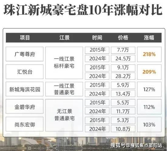 像同在珠江新城东区,占据一线江景的标杆顶豪盘,不仅总价更高,涨幅也远远甩开其它没有江景或者品质一般的豪宅盘。