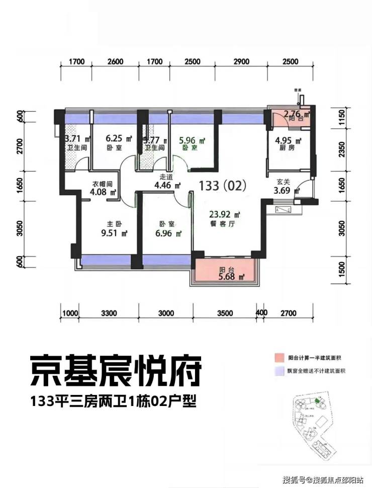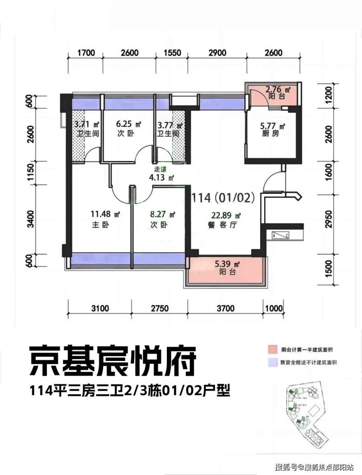 户型面积布局01/02114平三房两厅两卫设计的是竖厅南北通透格局,进门独立玄关,客厅3.85米开间,三开间朝南,3个卧室分别做到了3.25米/2.75米/2.75米的宽度,主卧大套间设计,U型厨房,还带1个小生活阳台,得房率约73.64%(不含赠送),客厅阳台主朝东南或西南向。