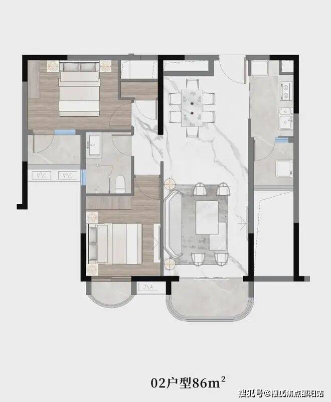 02户型:约86㎡,两房两厅一卫