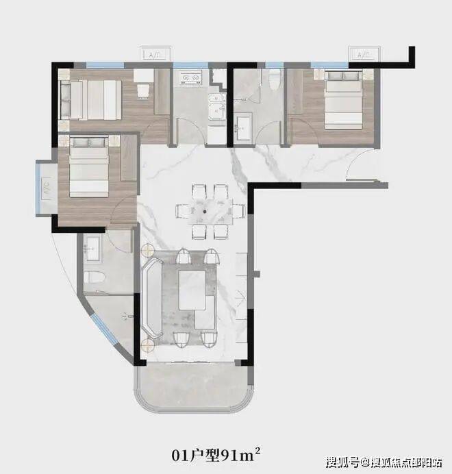 01户型:约91㎡,三房两厅两卫带主套