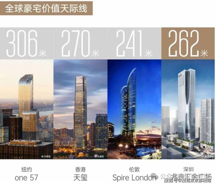 兆鑫汇金广场,深南大道封面地标,以其262米的超人之姿比肩全球顶级豪宅。世界顶级豪宅同样存在着一条价值天际线——纽约的one 57、香港的天玺、伦敦的Spire London,包括深圳的深圳湾壹号,作为各自区域的最高居所,矗立于当地人居的价值之巅。