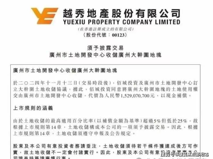 2024年11月13日,地块由广州土发中心中心收储,越秀地产因此将获得15.29亿元的现金补偿;