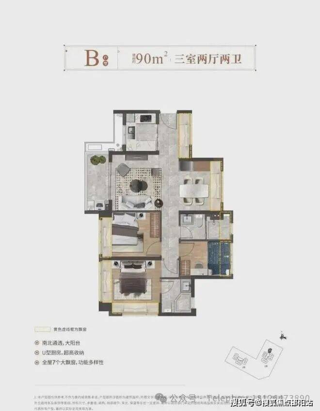 90㎡的3房2厅2卫,设计的是竖厅南北通透格局,全屋飘窗设计,客餐厅错开布局,主卧双飘窗,U型厨房。