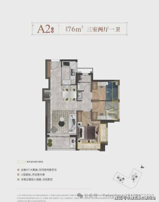76㎡的3房2厅1卫,设计的是竖厅格局,有设计S型冰箱预留位,主卧双飘窗设计,U型厨房,有西北向,西南向,东南朝向。