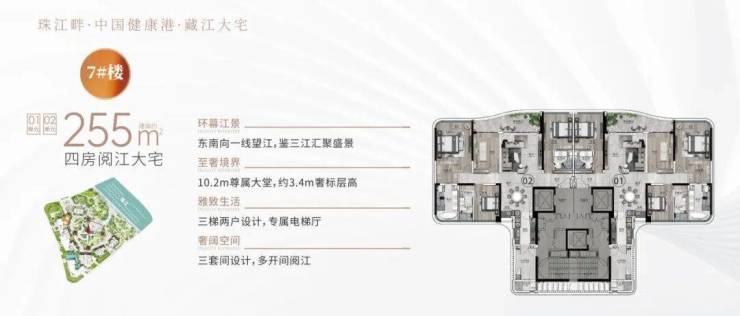 户型:建面约233-285㎡四至五房,东向/东南向一线望江,极致3.4-3.6m层高