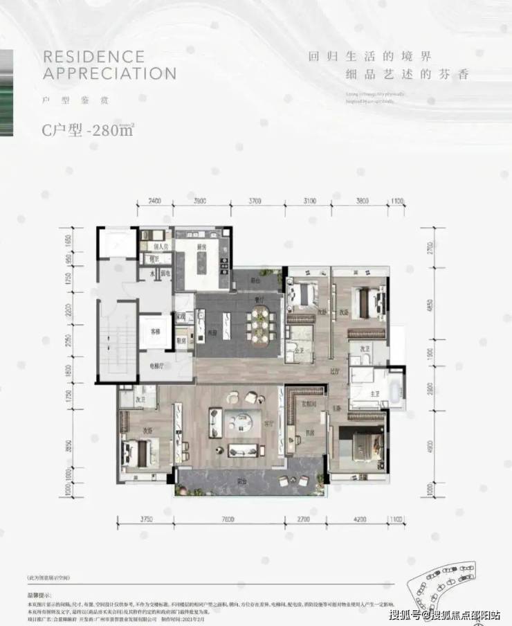 280㎡六房的四个休息房间,都配备了卫生间,电梯厅旁也设置了一个小小的鞋房。此外,中厨的面积更大,甚至能放下岛台,客厅的开间也达到了7.6米。