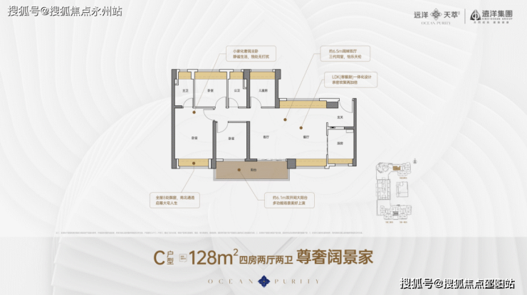 128㎡4房2卫,横厅南北通透,客餐厅开间6.5米,进门户玄关,客厅连接次卧出6.1米长的大阳台,主卧大套间设计,全屋8处飘窗,阳台主朝南向。