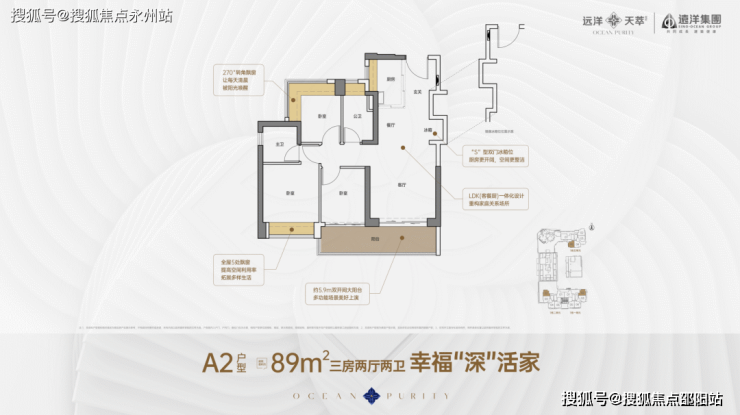 89㎡3房2卫,A2户型,传统竖厅,客厅开间3.5米,5.9米长大阳台,次卧双面转角采光,阳台朝向:西向、东向、南向。