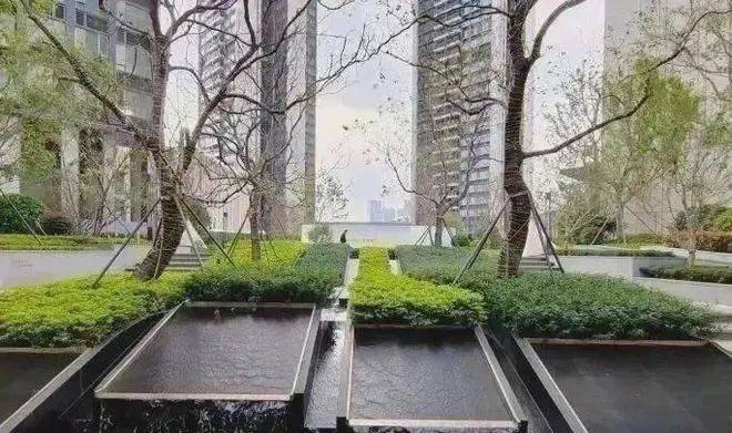 “近看落花至,远闻流水香”。听水入境,迈入第一重归家礼遇——“林下台地”生态迎宾水景,规则、细腻的线式跌水将视线高度抬高,淙淙的流水之音主动打破建筑的单调,赋予景观独特而灵动的美感。