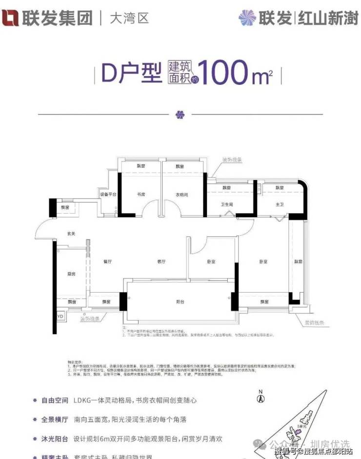 约100㎡的4房2厅2卫,设计的是横厅南北通透格局,独门独户还有私用公区,LDKG一体化灵动设计,做到了主卧双飘窗,五开间朝南,动静分区,U型大厨房,厨房烟道还做了外置空间,可以更好的利用厨房空间,卫生间干湿分离。赠送了阳台一半面积+9面飘窗+1个设备平台,超100%得房率,长约6米的大阳台主朝东南向。这是红山板块同面积段仅有的户型格局,整个红山只有46套。