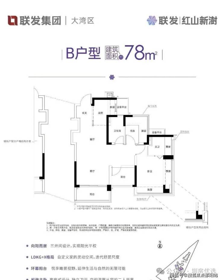 约78㎡的2+1房2厅2卫,设计的是竖厅LDKG+X格局,S墙设计预留冰箱卡槽位,做到了主卧双飘窗,三开间朝南,动静分区,U型大厨房,厨房烟道还做了外置空间,可以更好的利用厨房空间,卫生间三段式干湿分离。赠送了双阳台一半面积+6面飘窗+双设备平台,超100%得房率,东南或西南朝向。这是整个红山板块唯一一个80平以下做到了3房2卫的户型。
