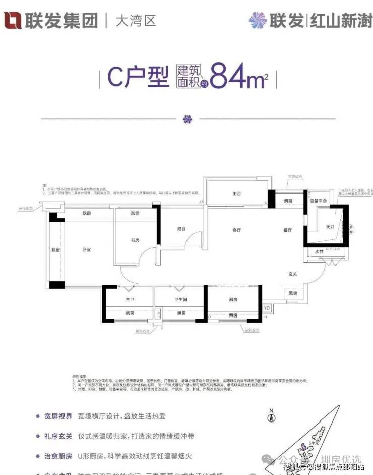 约84㎡的2+1房2厅2卫,设计的是横厅南北通透格局,独门独户还有私用公区,客餐厅一体化设计,做到了主卧双飘窗,动静分区,U型大厨房,厨房烟道还做了外置空间,可以更好的利用厨房空间,卫生间干湿分离。赠送了双阳台一半面积+8面飘窗+1个设备平台,超100%得房率,阳台主朝东北向。