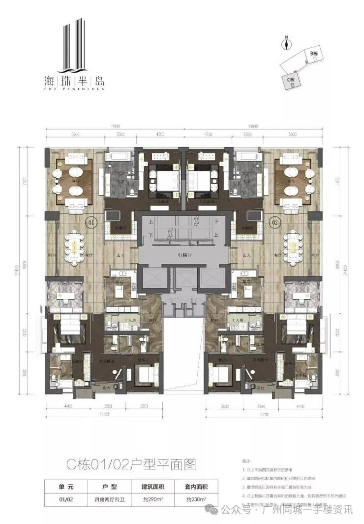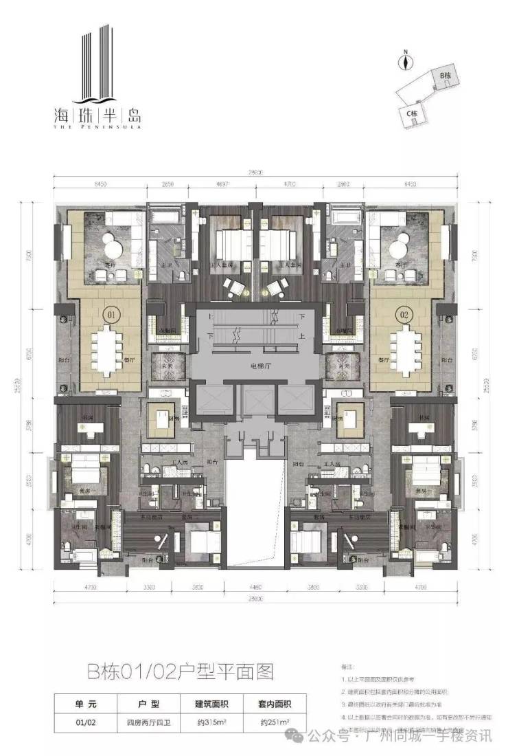 再来看看产品,资料显示三期共2栋高层(BC栋),楼高43层,主推290㎡、315㎡四房,实用率高达92%。