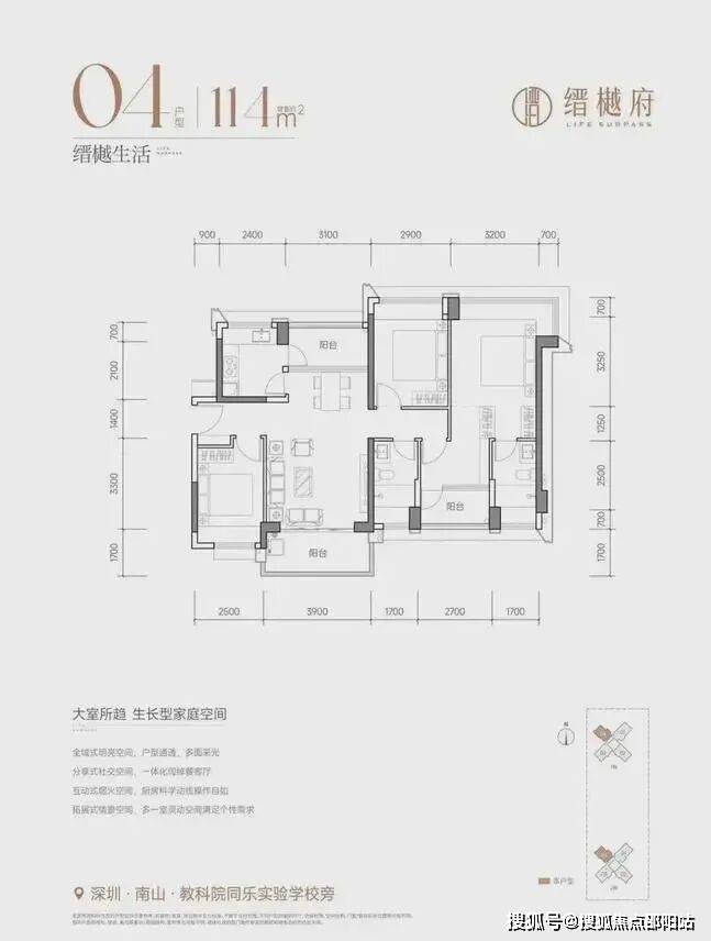 • 114㎡四房两厅两卫:客厅阳台朝东北,不过双大面宽采光且餐客厅完全通透,通风采光没问题。客厅开间3.9米,全屋飘窗部分赠送,客厅阳台、餐厅和一间次卧也有赠送面积,得房率能达到81%左右,加上赠送面积使用率基本能达到90%左右。