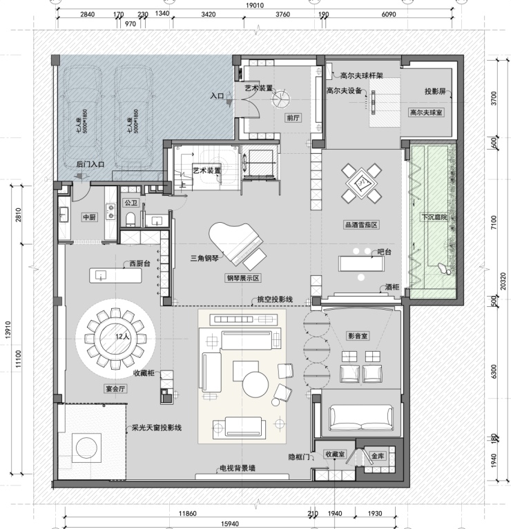 负一层下沉庭院周边设工人房、家政间,储物无忧;