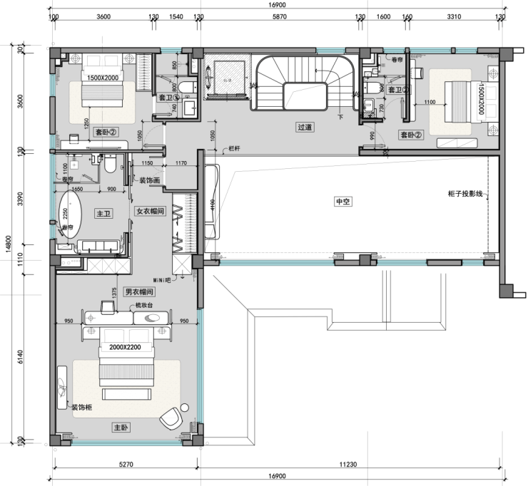 二层卧室布局错落有致,挑空区丰富空间层次;