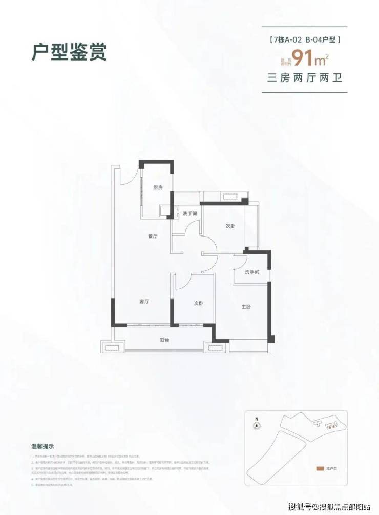 91㎡的3房2厅2卫,设计的是经典竖厅格局,进门入户玄关,LDKB一体化设计,三开间朝南,动静分区,客厅连接次卧出大阳台,L型厨房,公卫三段式分离,得房率约82%(不含赠送),东南朝向。