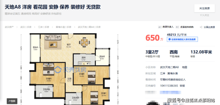 🏠面积132平,挂650万,(价格可谈)三房二厅二卫,单价40000多。小区还有几套同户型的房源。目前这个房子是小区同户型最便宜的。也有其它楼层可以对比。预算在650万左右这个房子必看。