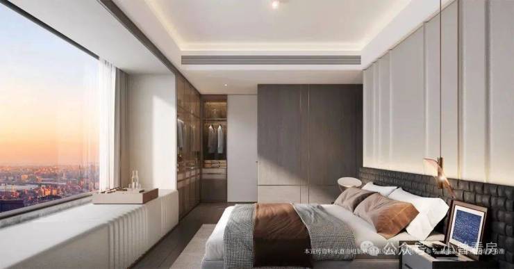 最吸睛的是它的主卧去到28㎡,而且做了约12米长的270°无遮挡U型飘窗,室内光线敞亮,空间通透,非常有豪宅感。